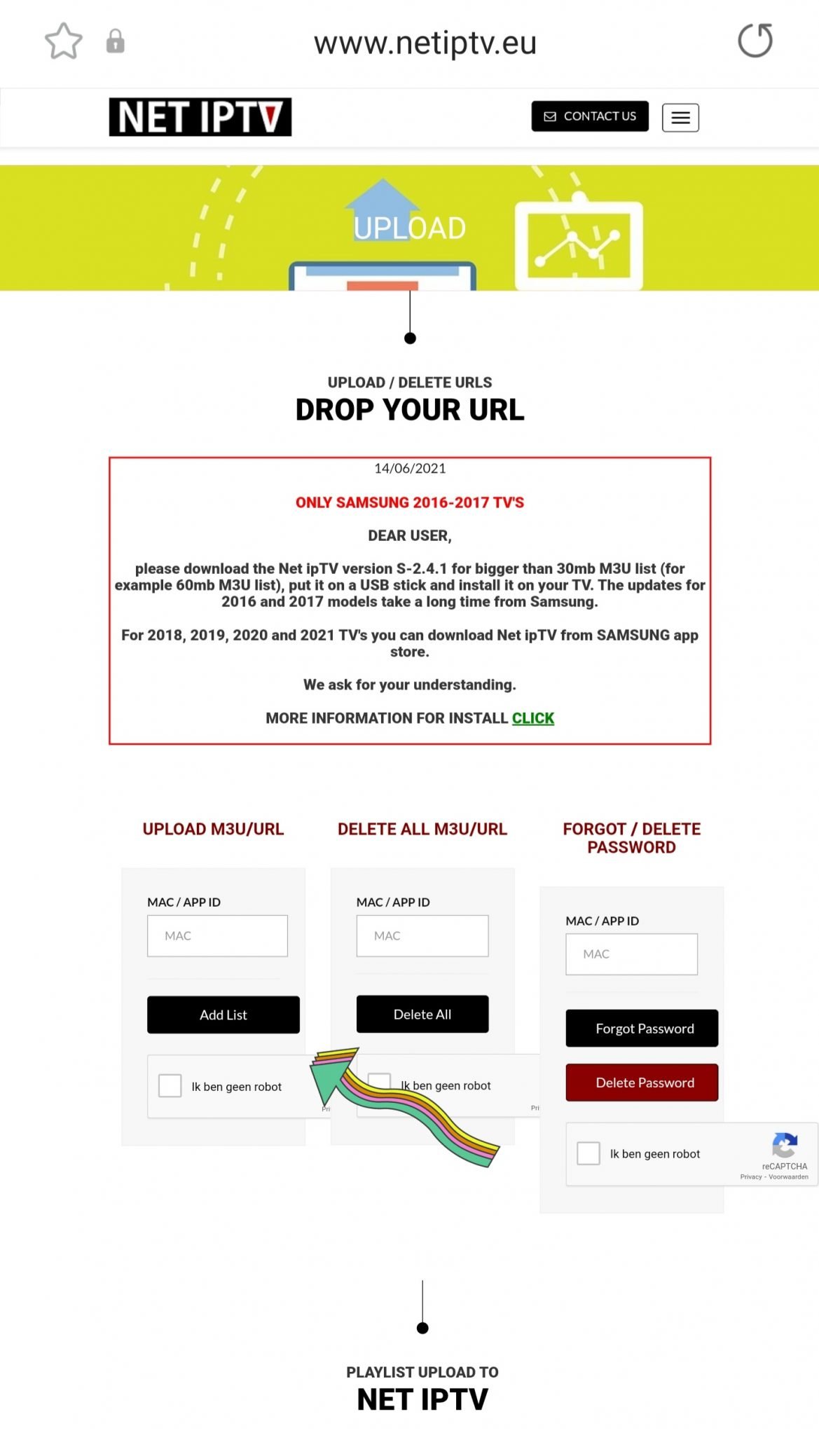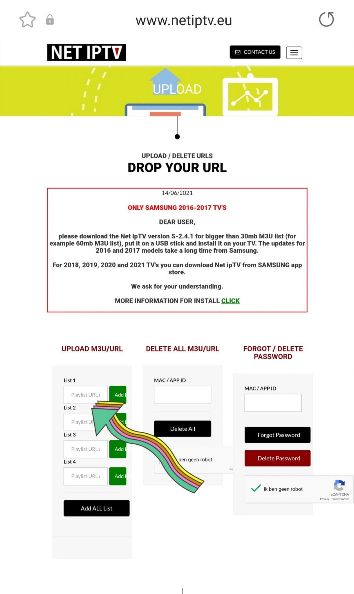 U gaat met uw Mac adres naar de website van Net IPTV (Klik hier). U vult onder het kopje “Upload m3u/url” uw Mac adres in. Vervolgens vinkt u aan dat u geen robot bent en klikt daarna op “Add list”.
